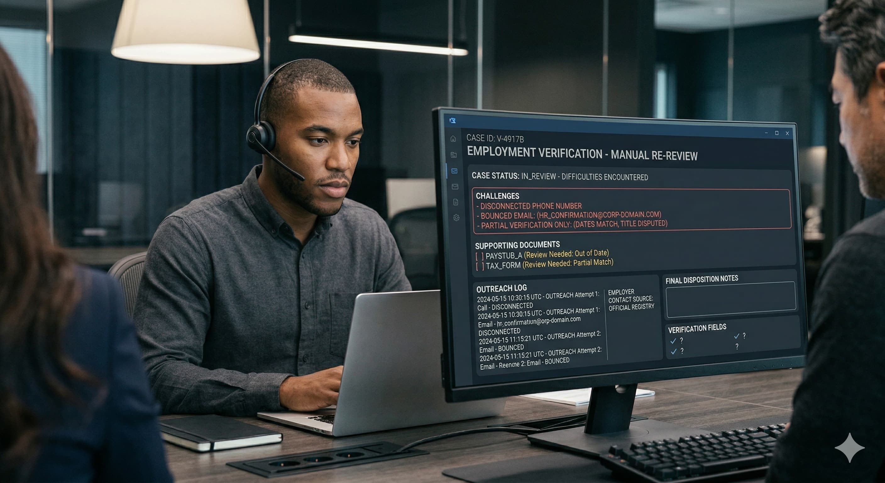 Background screening employment verification also goes manual when the candidate's stated work history conflicts with other records. If a resume lists "Director of Operations" but a database returns "Operations Coordinator," direct employer contact is the only way to clarify which is accurate. Client SLAs and hiring deadlines add pressure too: when an automated check stalls for days with no response, a phone call or fax to the employer may be the fastest path to resolution.